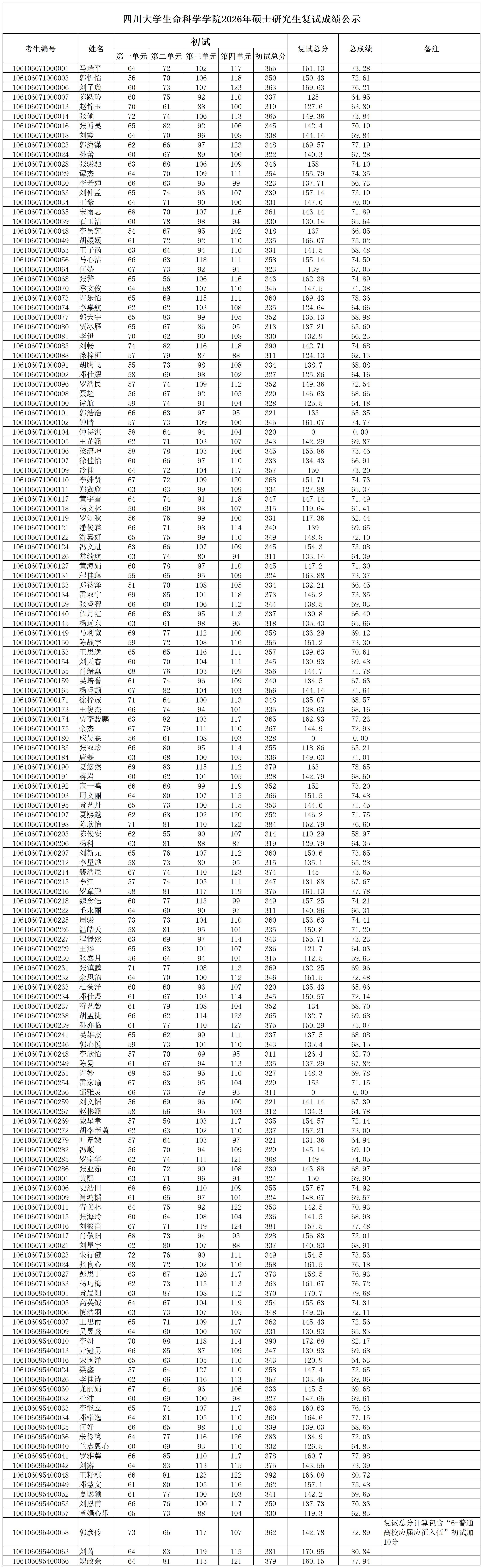 四川大学生命科学学院2026年硕士研究生复试成绩公示