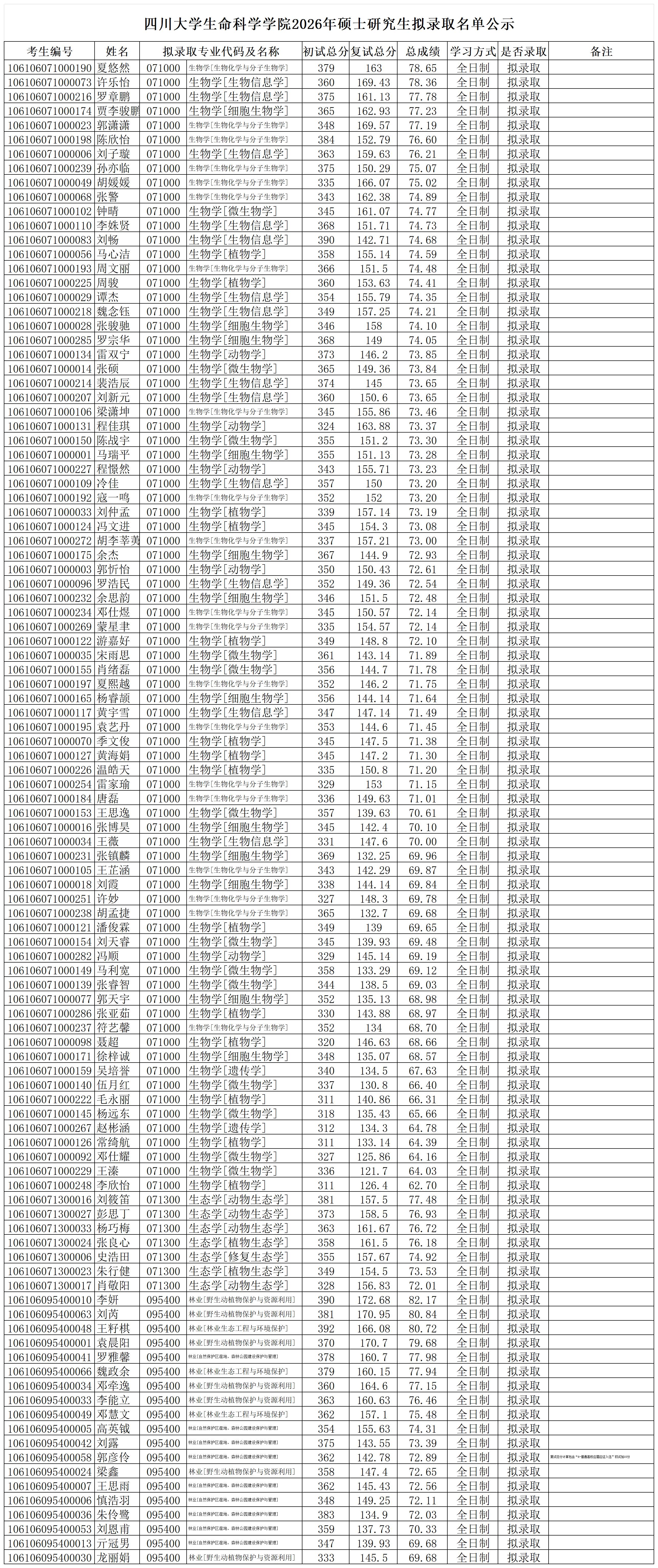 四川大学生命科学学院2026年硕士研究生拟录取名单公示