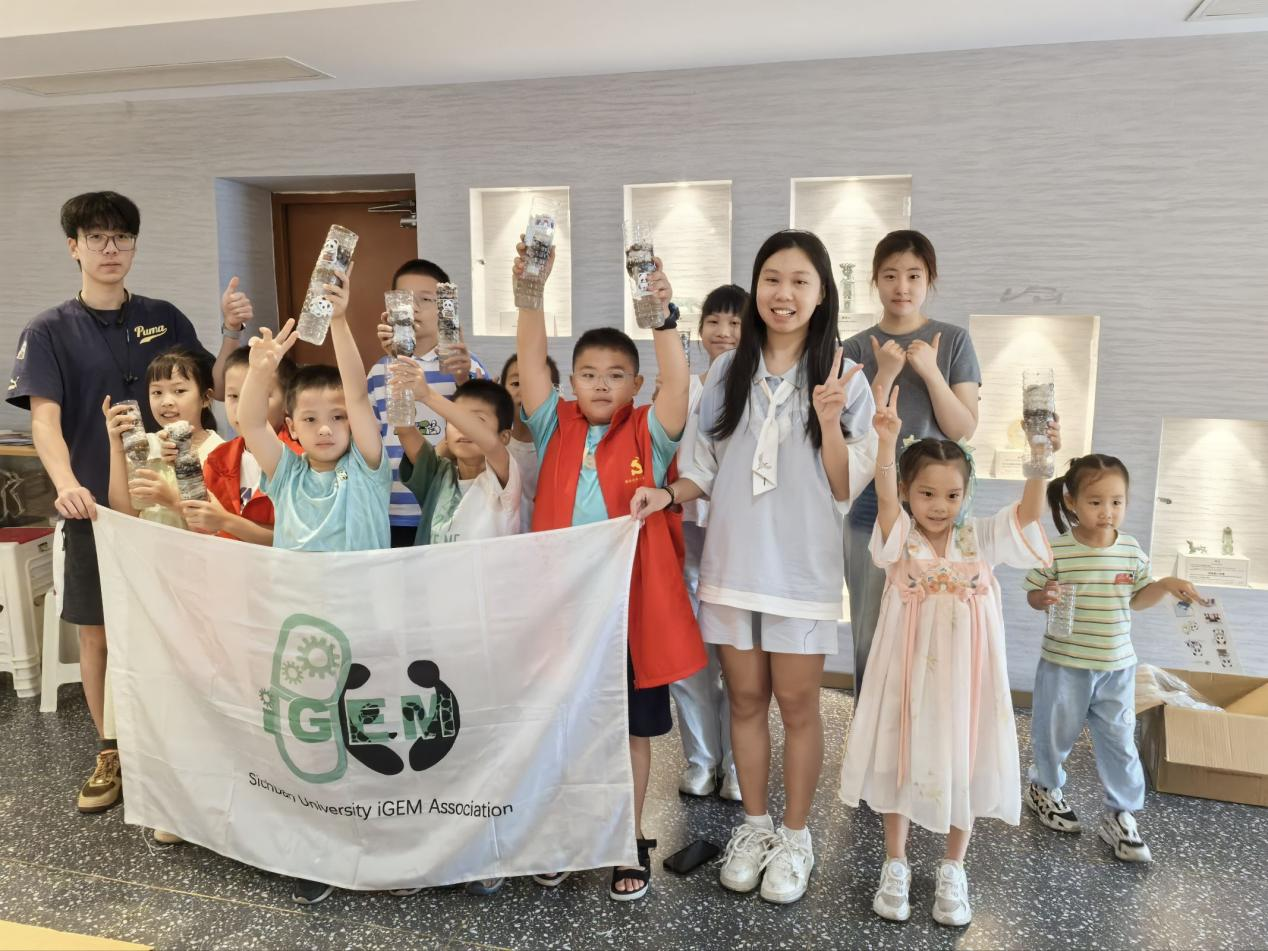 有价值的科研成果离不开扎实的“人类实践(Human Practice)”。备赛期间,团队秉持“顶天立地”的科研理念,一方面深入美富特环保集团、四川清和科技有限公司等企业调研,并走访了四川省生态环境厅,从产业需求和宏观政策层面深化对课题的理解,让研究扎根于中国大地;另一方面,团队通过举办“四川大学微生物应用设计大赛”、前往中小学开展科普宣讲等活动,将前沿科学知识反哺社会,积极传播合成生物学火种,实现了科研探索与社会服务的有机统一。这些活动培养了团队成员的社会责任感,提升了队员的使命感,为培养做“顶天立地”科学研究的科研工作者奠定了基础。