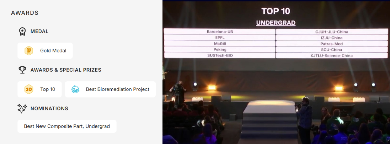 2025年国际遗传工程机器大赛(iGEM)全球总决赛于10月31日在法国巴黎落幕,四川大学SCU-China代表队取得历史性突破!团队不仅荣获金奖,更在两大核心赛道双双告捷:其一,在与剑桥、牛津、耶鲁、斯坦福等世界顶尖学府的激烈角逐中,成功跻身本科生组全球前十;其二,于竞争更为激烈的本科生与研究生队伍合并评奖赛道中,一举斩获“最佳生物修复项目”(Best Bioremediation Project)赛道最佳项目奖,并荣获“最佳新型组合部件”(Best New Composite Part)提名,最终创下SCU-China建队14年以来的最佳成绩。