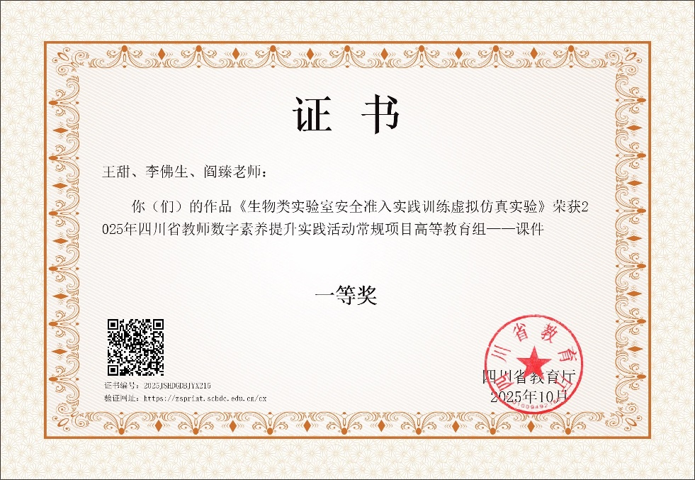 近日,由我院王甜、李佛生、阎臻三位教师申报的常规项目作品“生物类实验室安全准入实践训练虚拟仿真实验”,在2025年四川省教师数字素养提升实践活动中脱颖而出,荣获一等奖。该活动由四川省教育厅主办,依据《四川省教育厅关于举办2025年四川省教师数字素养提升实践活动的通知》部署,旨在强化教师队伍数字素养培育,推进课程改革深化,促进信息技术与教育教学深度融合创新。