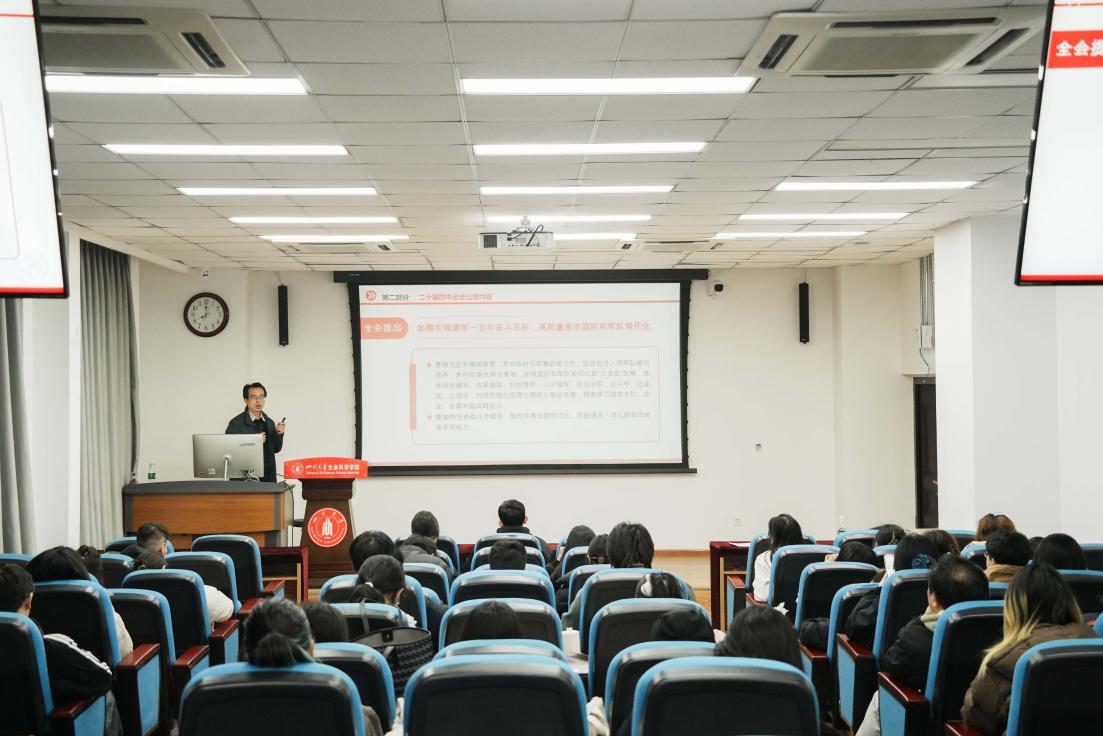 毛院长首先围绕党的二十届四中全会精神,系统解读了全会公报内容,重点阐述了“十五五”时期经济社会发展原则与主要目标,并就建设现代化产业体系、加快高水平科技自立自强、建设强大国内市场、加快构建高水平社会主义市场经济体制、扩大高水平对外开放、加快农业农村现代化等一系列重要内容进行了深入阐述。本次讲授为党员、发展对象和入党积极分子筑牢思想根基、强化纪律意识提供了重要指导,激励大家奋力投身中国式现代化实践,也为学院党建工作注入了新的动力。