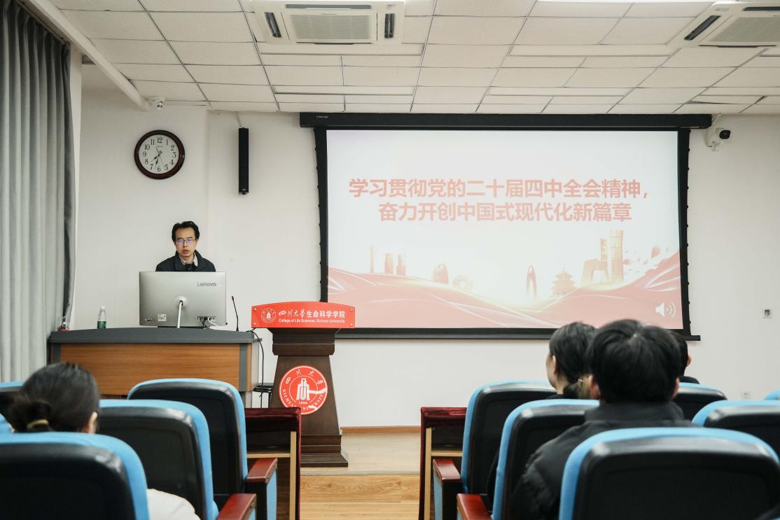 2025年12月11日,生命科学学院院长毛康珊教授在学院A101多功能厅,为我院学生党员、发展对象、入党积极分子讲授题为《学习贯彻党的二十届四中全会精神,奋力开创中国式现代化新篇章》专题党课。