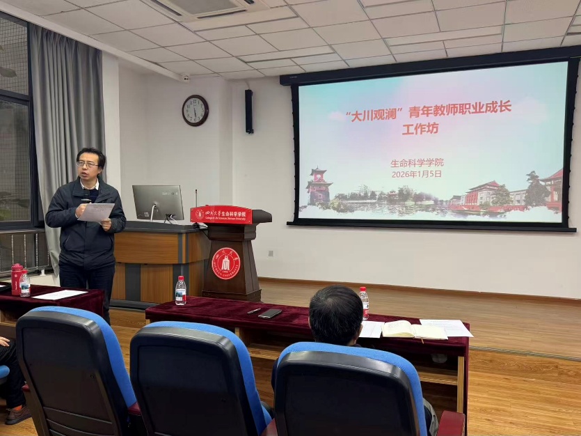 为深入贯彻落实《四川大学关于促进青年教师成长的若干措施》文件精神,积极响应学校关于开展 “大川观澜”青年教师职业成长工作坊的号召,我院于1月5日下午在生命科学学院学术报告厅成功举办2026年度首次青年教师职业成长工作坊活动。四川大学人才办副主任穆飞、学院党委书记林宏辉、院长毛康珊、副院长李中瀚,学院资深教授张跃林、杨毅、何兴金、邹方东、孙群、曹毅、张胜等,以及学院60余位青年教师参加了本次工作坊活动。