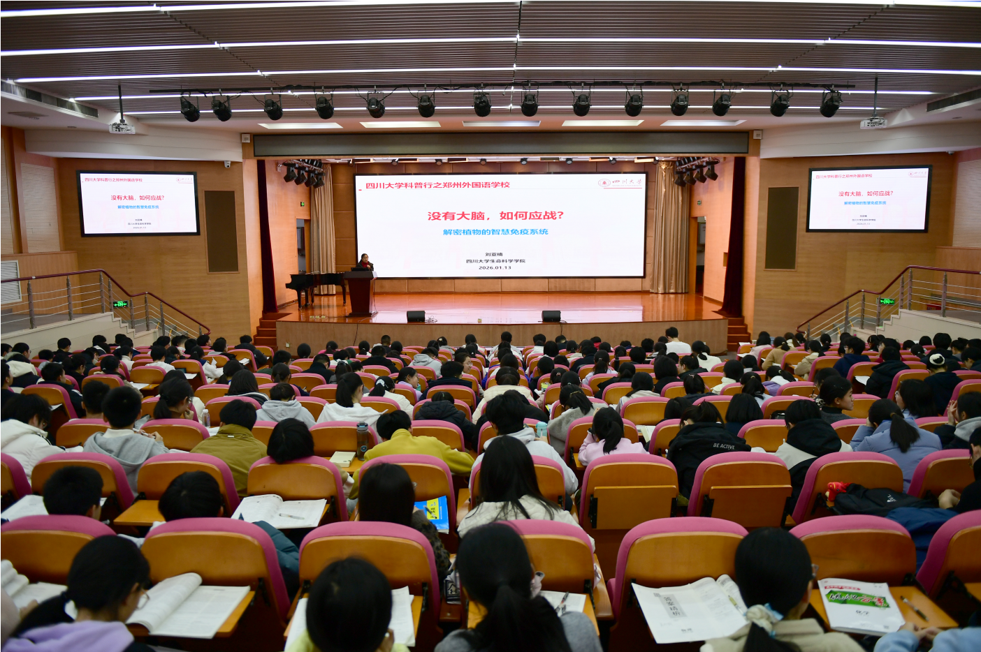 与此同时,生物科学系刘亚楠老师赴河南郑州开展科普宣讲,先后走进郑州市第一高级中学、郑州外国语学校、郑州市第四高级中学、郑州市第七高级中学这四所重点中学,为近千名高中学子献上了一场场生动有趣的植物研究科普盛宴。她以自身科研积淀为基础,将植物的智慧免疫系统喻为“静默情报网”,生动阐释了“哨兵受体”识别入侵、“抗病蛋白”启动细胞程序性死亡、化学信号远程激活系统抗性等微观防御机制。这场讲座不仅揭示了植物“无脑抗疫”的生命智慧,更引导学生触摸到“培育抗病作物、发展绿色农业”的前沿科研脉络。在系统介四川大学优势的同时,她着重分析了“选择川大”背后的战略视野:成都作为“成渝地区双城经济圈”的核心,正肩负着打造国家经济增长“第四极”和“战略大后方”的时代使命。选择位于成都的四川大学,意味着选择与一座充满活力与机遇的未来之城共同成长,将在国家重大战略布局中赢得更广阔的发展平台。她建议同学们将个人理想融入时代潮流,科学规划学业与未来。