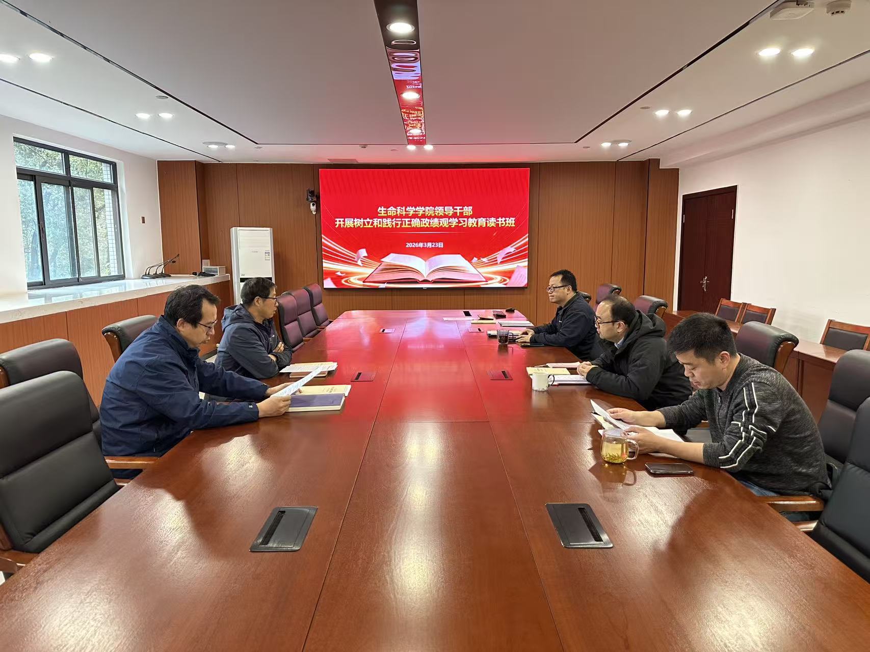 3月23日上午,生命科学学院领导干部树立和践行正确政绩观学习教育读书班开班并开展集中学习。院党委书记林宏辉同志主持会议并讲话,院领导班子成员参加。